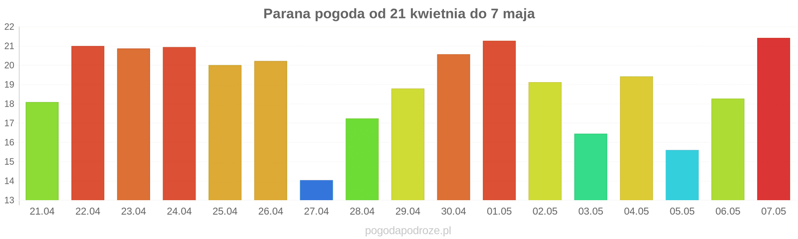 W nocy: 14℃Nad ranem: 7℃Wieczorem: 16℃słonecznieCiśnienie: 1015Wilgotność: 51%Wiatr: 5