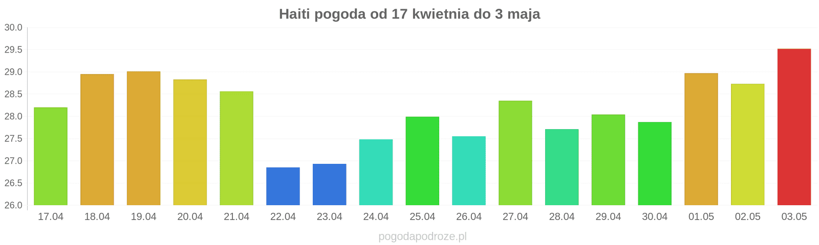 Jeśli damy wiarę prognozom z odstępem czasu 7 dni to czeka nas ochłodzenie w Haiti w przyszłym tygodniu. Temperatura w ciągu dnia powinna spaść do 28 stopni.