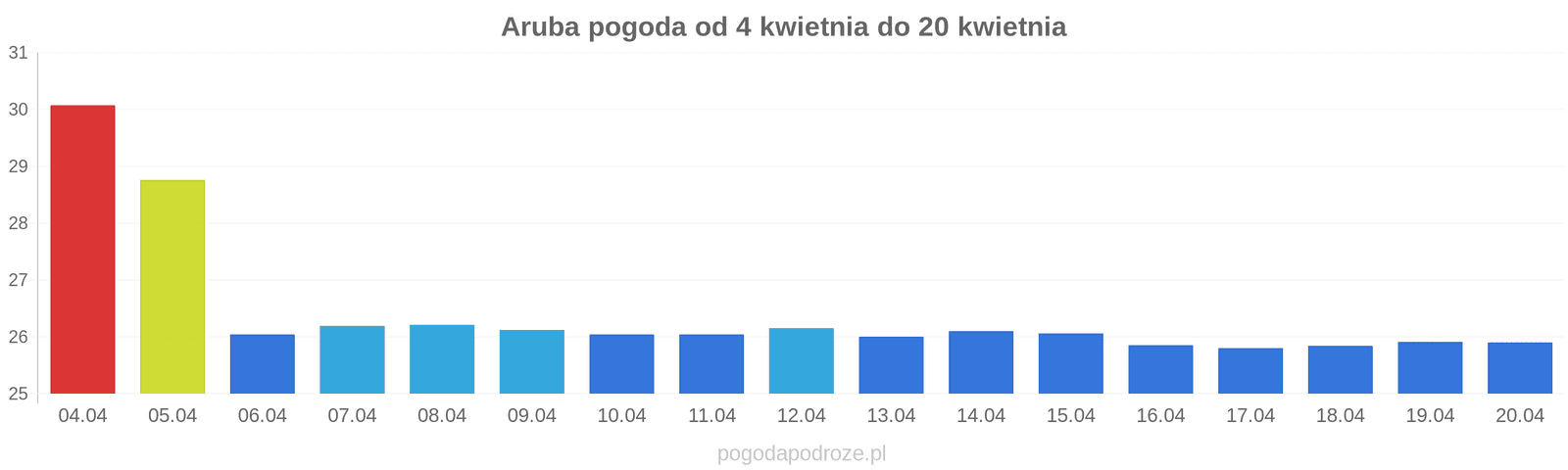 Jeśli damy wiarę prognozom z odstępem czasu 7 dni to czeka nas ochłodzenie w Arubie w przyszłym tygodniu. Temperatura w ciągu dnia powinna spaść do 26 stopni.