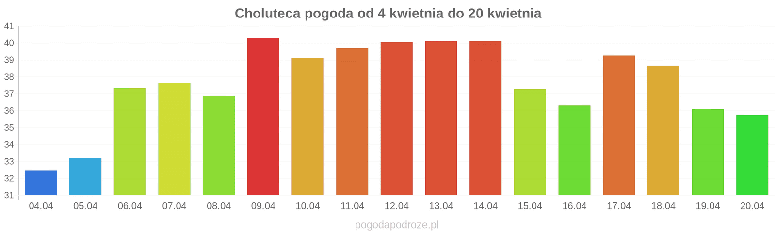 Jeśli wierzyć prognozom z odstępem czasu 7 dni to czeka nas dużo ciepła w Choluteca w przyszłym tygodniu. Temperatura w ciągu dnia osiągnie 40 stopni.