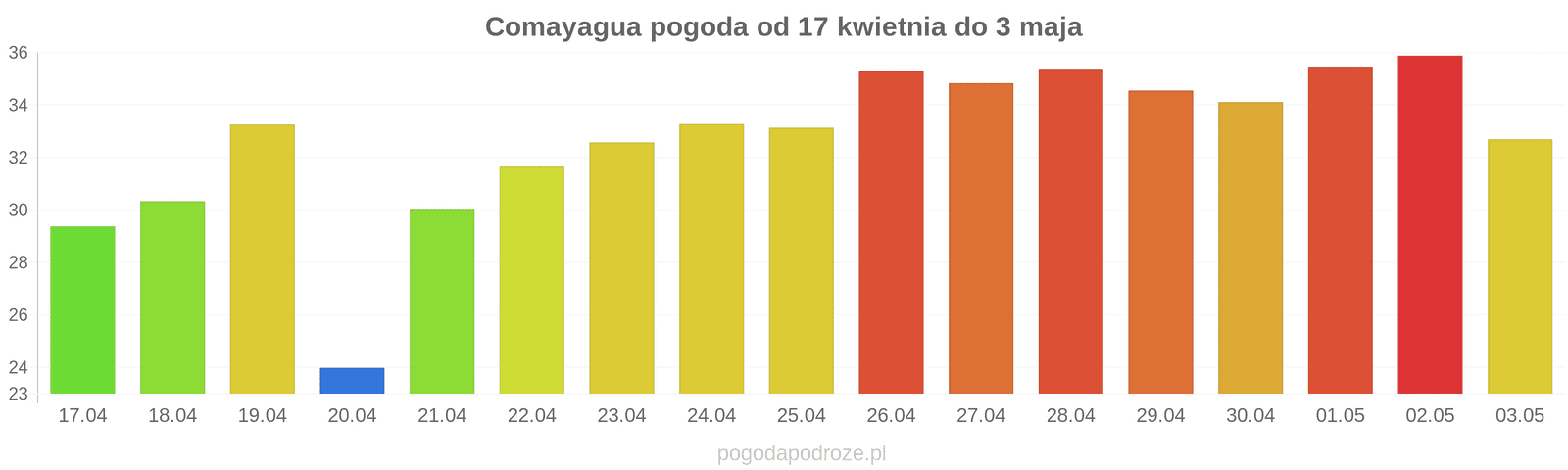 Jeśli wierzyć prognozom z odstępem czasu 7 dni to czeka nas dużo ciepła w Comayagua w przyszłym tygodniu. Temperatura w ciągu dnia osiągnie 35 stopni.