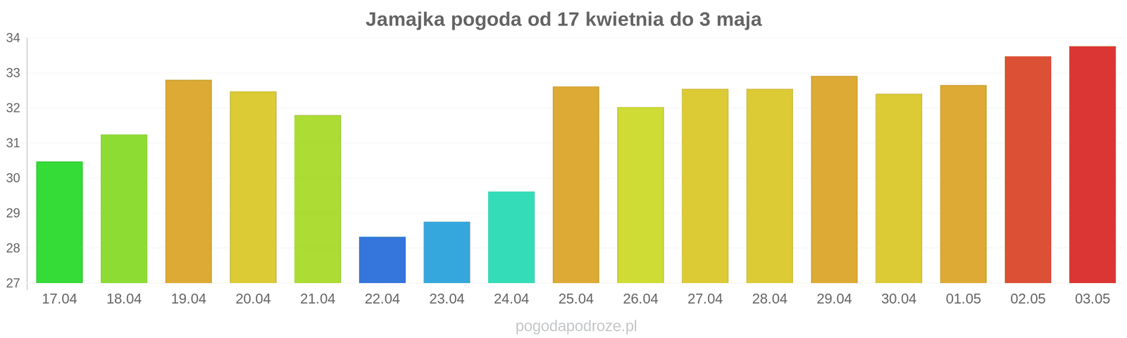 Jeśli damy wiarę prognozom z odstępem czasu 7 dni to czeka nas ochłodzenie na Jamajce w przyszłym tygodniu. Temperatura w ciągu dnia powinna spaść do 32 stopni.