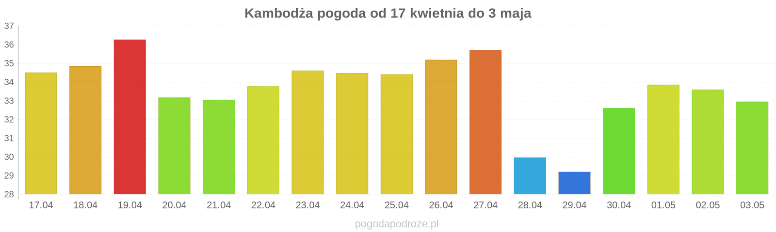 Jeśli damy wiarę prognozom z odstępem czasu 7 dni to czeka nas ochłodzenie w Kambodży w przyszłym tygodniu. Temperatura w ciągu dnia powinna spaść do 34 stopni.
