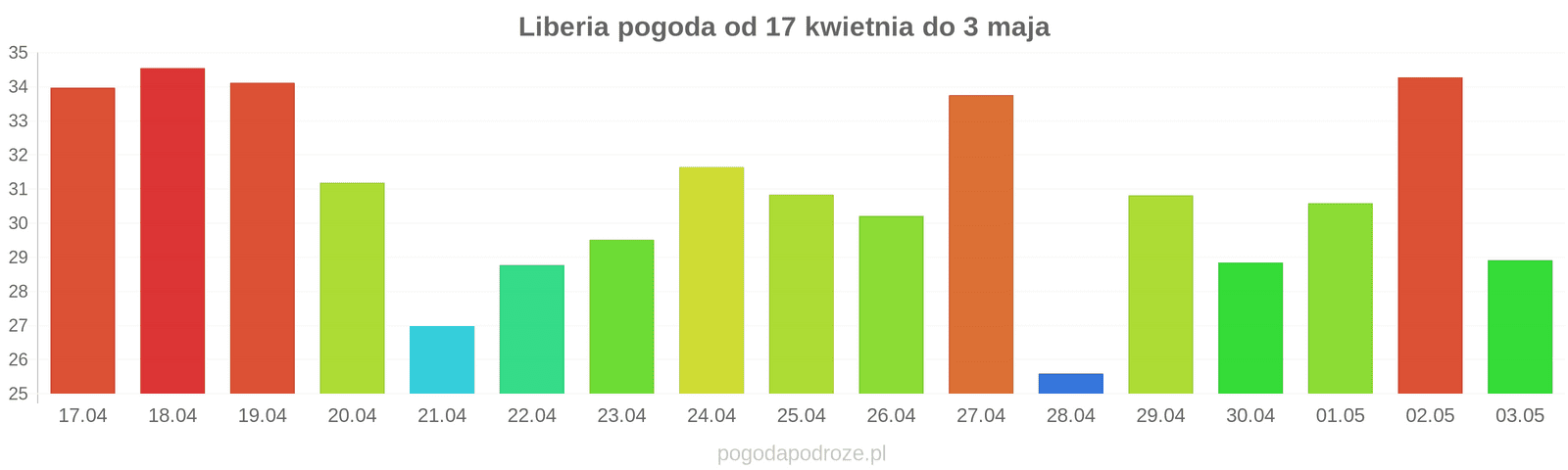 Jeśli damy wiarę prognozom z odstępem czasu 7 dni to czeka nas ochłodzenie w Liberii w przyszłym tygodniu. Temperatura w ciągu dnia powinna spaść do 30 stopni.