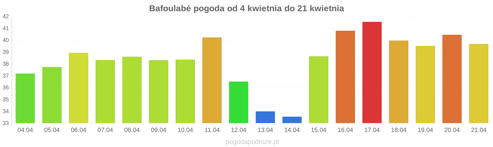 Jeśli damy wiarę prognozom z odstępem czasu 7 dni to czeka nas ochłodzenie w Bafoulabé w przyszłym tygodniu. Temperatura w ciągu dnia powinna spaść do 34 stopni.