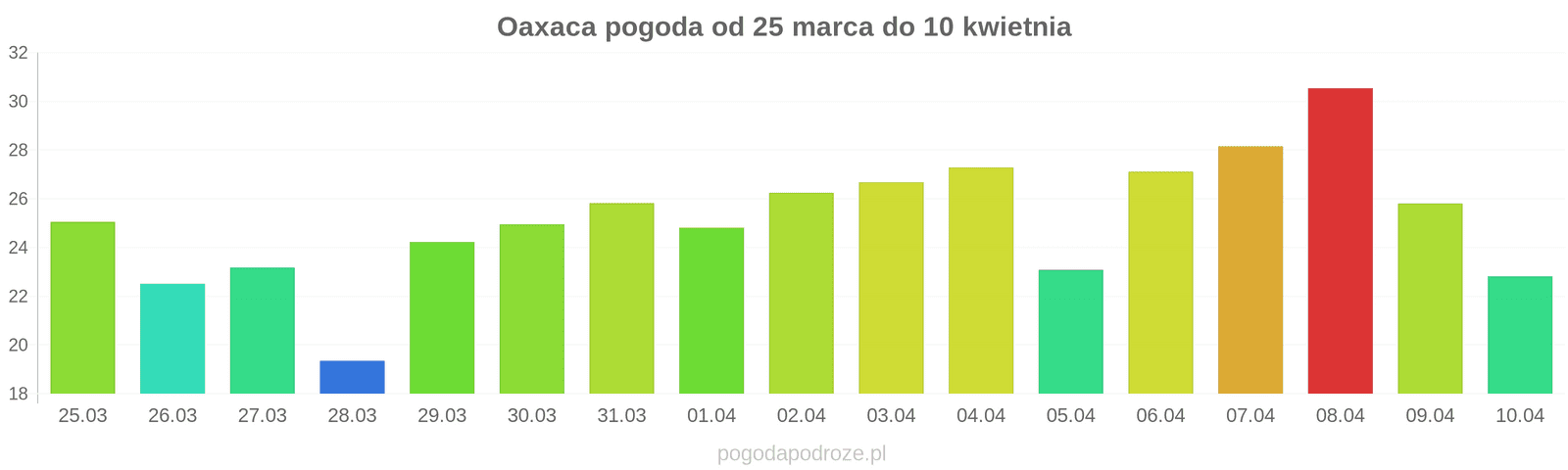 Najcieplejszym miesiącem w Oaxaca jest kwiecień. Średnia temperatura to mniej więcej 33 stopnie.