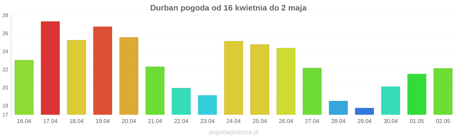 Jeśli damy wiarę prognozom z odstępem czasu 7 dni to czeka nas ochłodzenie w Durban w przyszłym tygodniu. Temperatura w ciągu dnia powinna spaść do 25 stopni.