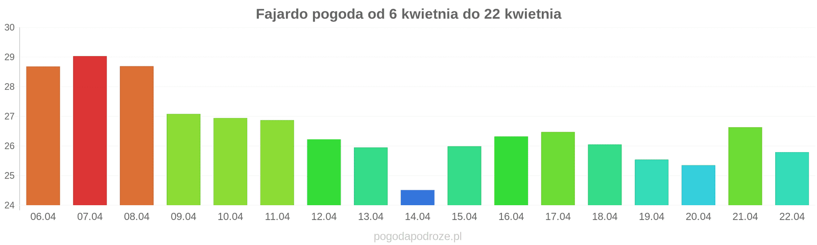 Jeśli damy wiarę prognozom z odstępem czasu 7 dni to czeka nas ochłodzenie w Fajardo w przyszłym tygodniu. Temperatura w ciągu dnia powinna spaść do 26 stopni.
