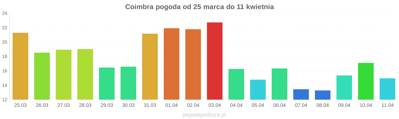 Opis pogody w najbliżych 10 dniach, Sprawdź kiedy będzie najcieplej, kiedy będzie słonecznie, a kiedy jest ryzyko opadów i zachmurzenia w Coimbra. Warunki pogodowe oraz prognoza jest aktualizowana codziennie.