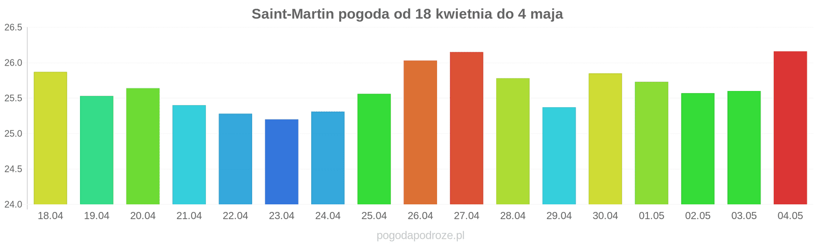 W przypadku dnia jutrzejszego można mówić o spadku temperatury na Saint-Martin. Słupek termometry spadnie i wyniesie w ciągu dnia 25 stopni.