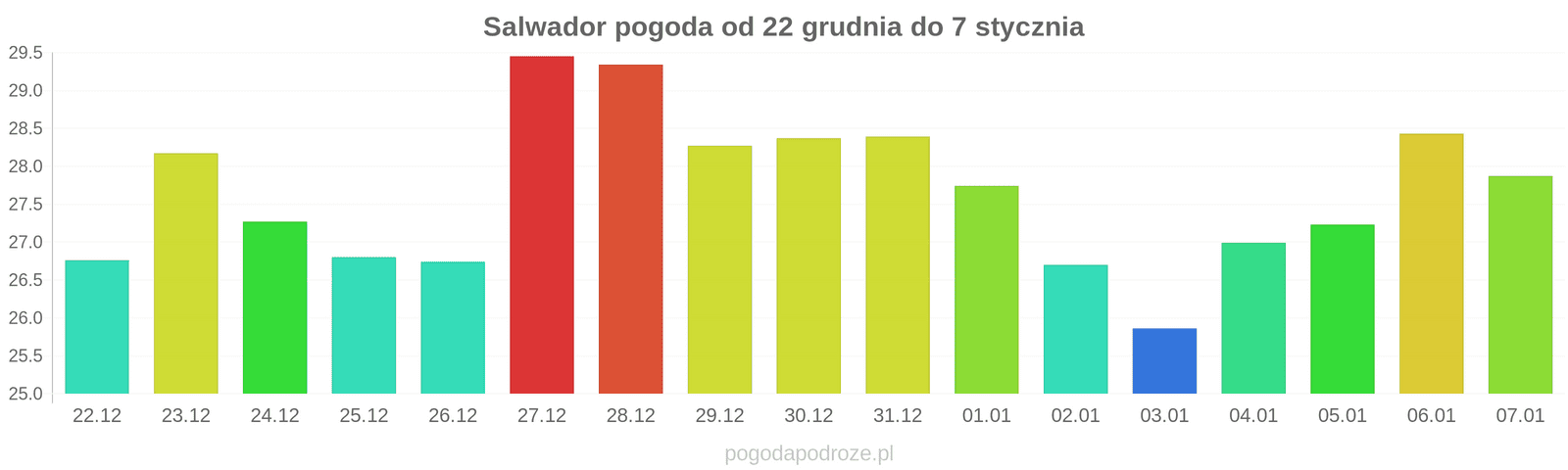 Jeśli wierzyć prognozom z odstępem czasu 7 dni to czeka nas dużo ciepła w Salwadorze w przyszłym tygodniu. Temperatura w ciągu dnia osiągnie 28 stopni.