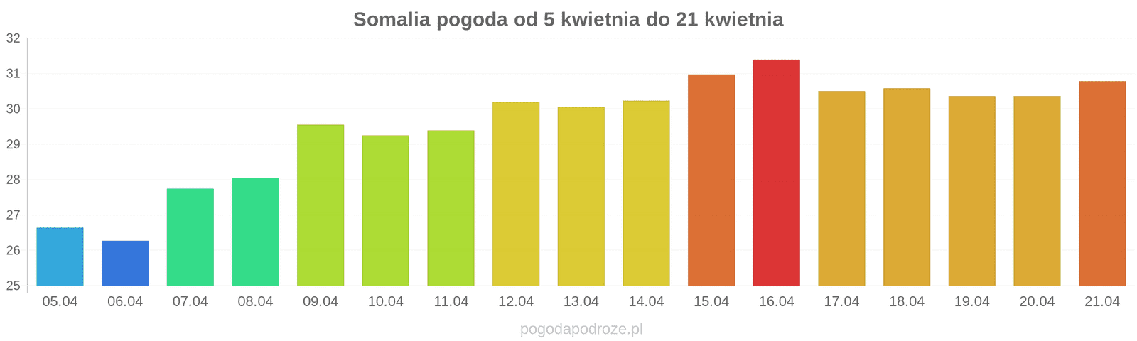 Jeśli wierzyć prognozom z odstępem czasu 7 dni to czeka nas dużo ciepła w Somalia w przyszłym tygodniu. Temperatura w ciągu dnia osiągnie 30 stopni.