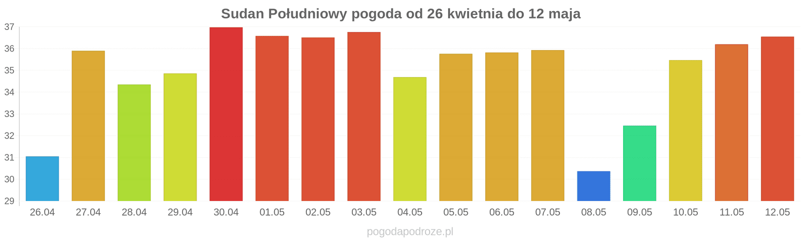 W przypadku dnia jutrzejszego można mówić o spadku temperatury w Sudanie Południowym. Słupek termometry spadnie i wyniesie w ciągu dnia 34 stopnie.