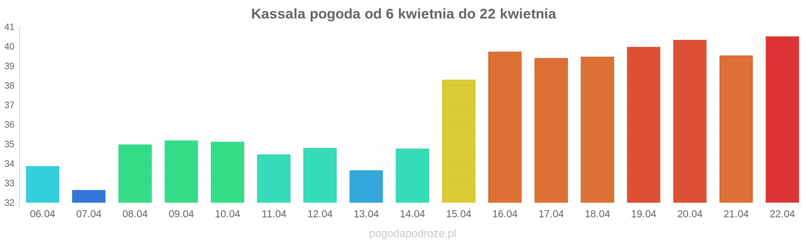 Jeśli wierzyć prognozom z odstępem czasu 7 dni to czeka nas dużo ciepła w Kassala w przyszłym tygodniu. Temperatura w ciągu dnia osiągnie 35 stopni.