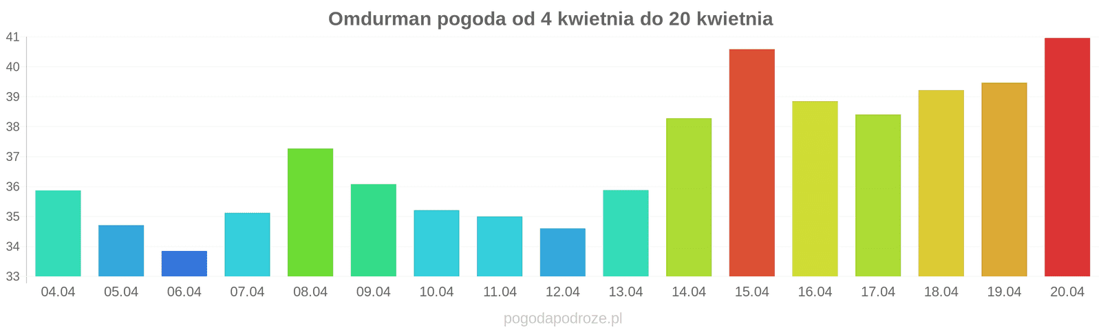 Jeśli damy wiarę prognozom z odstępem czasu 7 dni to czeka nas ochłodzenie w Omdurman w przyszłym tygodniu. Temperatura w ciągu dnia powinna spaść do 35 stopni.