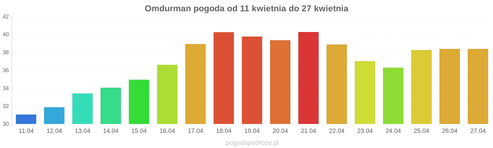 Jeśli wierzyć prognozom z odstępem czasu 7 dni to czeka nas dużo ciepła w Omdurman w przyszłym tygodniu. Temperatura w ciągu dnia osiągnie 40 stopni.