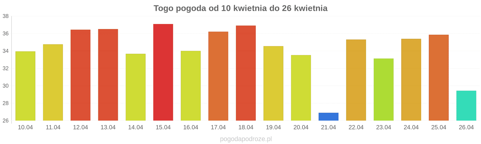 Jeśli damy wiarę prognozom z odstępem czasu 7 dni to czeka nas ochłodzenie w Togo w przyszłym tygodniu. Temperatura w ciągu dnia powinna spaść do 35 stopni.
