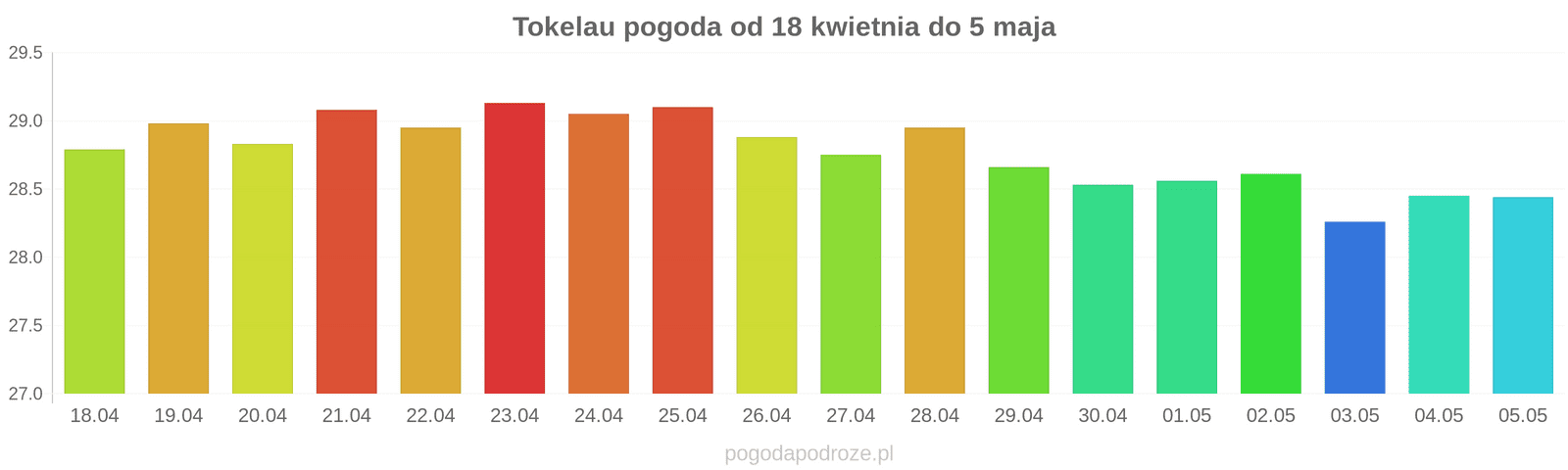 Jeśli damy wiarę prognozom z odstępem czasu 7 dni to czeka nas ochłodzenie na Tokelau w przyszłym tygodniu. Temperatura w ciągu dnia powinna spaść do 29 stopni.