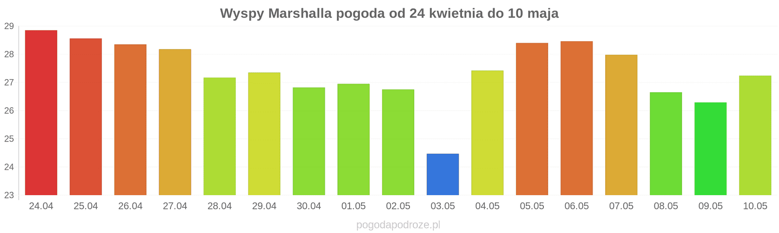 Jeśli damy wiarę prognozom z odstępem czasu 7 dni to czeka nas ochłodzenie na Wyspach Marshalla w przyszłym tygodniu. Temperatura w ciągu dnia powinna spaść do 27 stopni.