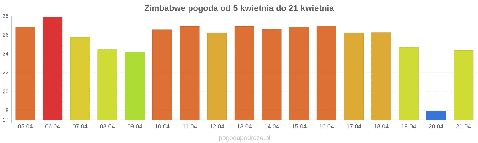 Jeśli damy wiarę prognozom z odstępem czasu 7 dni to czeka nas ochłodzenie w Zimbabwe w przyszłym tygodniu. Temperatura w ciągu dnia powinna spaść do 27 stopni.