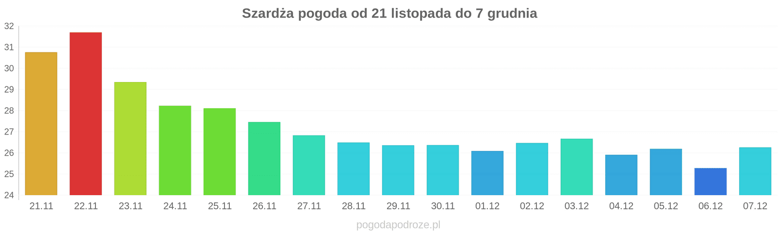 W nocy temperatura może spaść do: 23℃Wieczorna temperatura: 24℃Warunki pogodowe: ociupinkę chmurWilgotność: 31%Siła wiatru: 4Czy będzie pochmurno: 11%